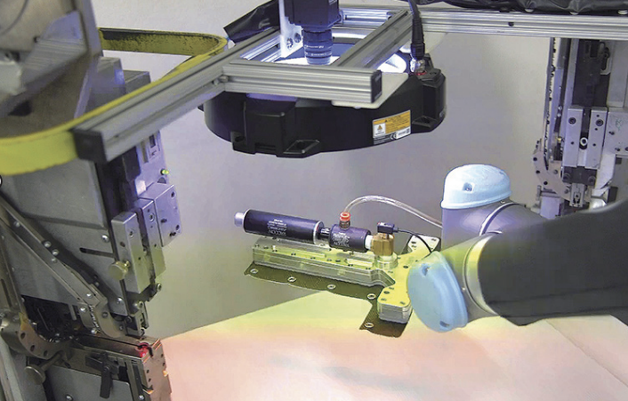 这家位于美国亚利桑那州的公司对其协作机器人进行了编程,以拾取预先切割的织物材料,然后该机器人将其移动通过插口机,插入 5 个公按扣,然后再移至第二台机器,添加 5 个母按扣。在协作机器人将零件展示给视觉相机,由相机检查是否正确添加了按扣以后,为期 25 秒钟的运行周期就结束了。根据检查的结果,协作机器人将完成的工件放置在“合格”堆或“废料”堆中。